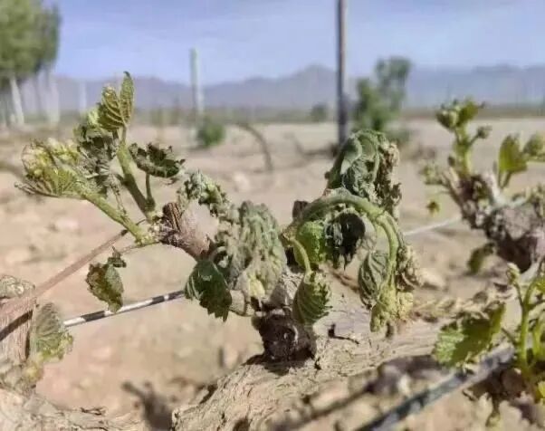4月中下旬到5月上旬是贺兰山东麓葡萄晚霜冻害容易发生的时期,此期正值葡萄萌芽、展叶、抽枝时期,0℃以下的低温会对葡萄植株的地上部分特别是幼嫩器官造成损伤,甚至导致死亡,但不会对树体造成较大损伤,只要加强管理,调整树体结构,来年可实现正常生产。